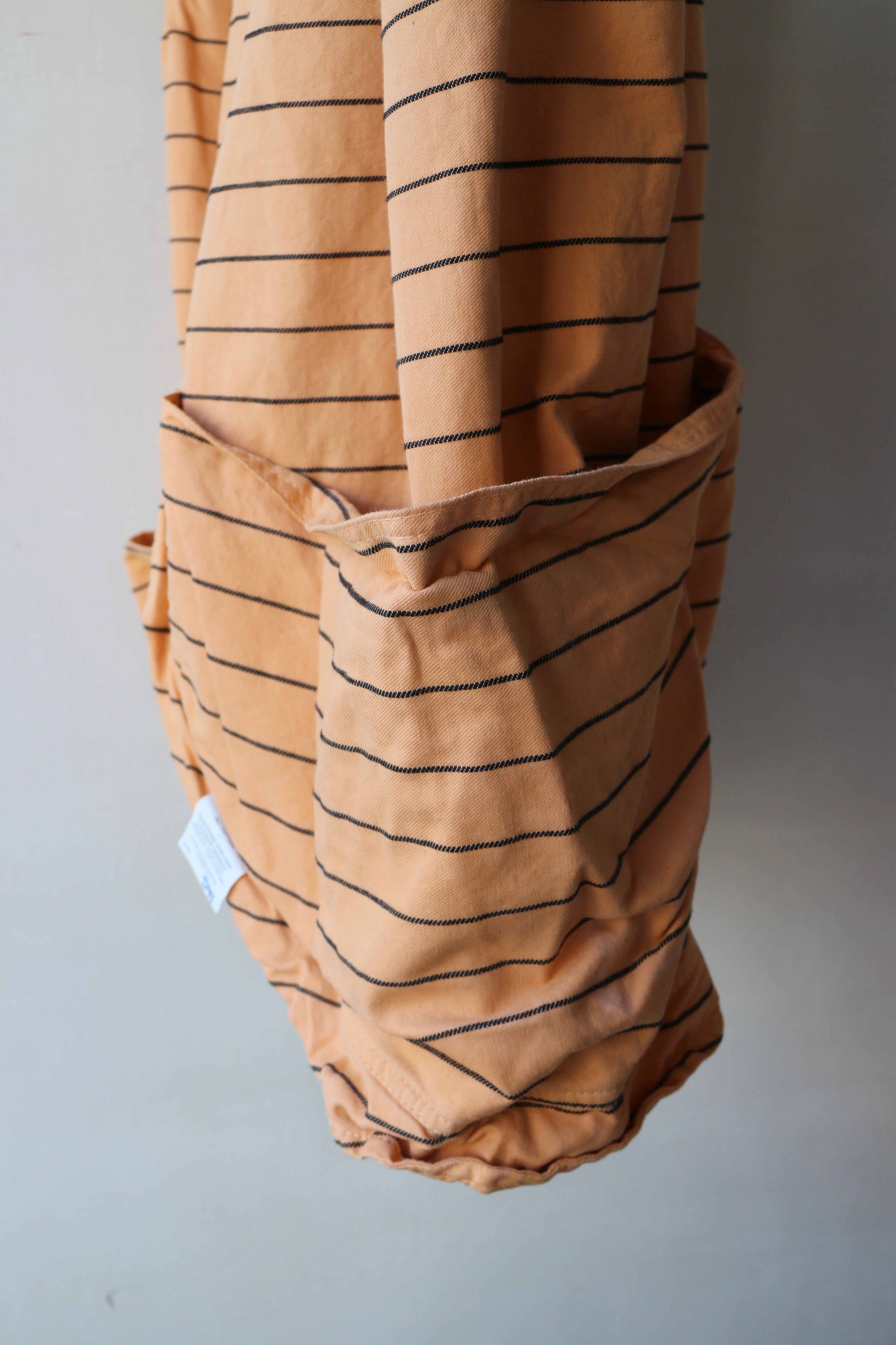 前後の裾が繋がる独特なパターンと、身体の両サイドを大きく包み込むカーブポケットが印象的なデザインです。